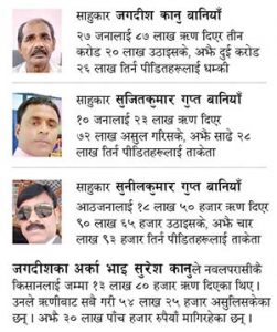 भंगहा– ५ कै रामवती देवीले साहुसँग पैसा नै नलिई ऋणको भारी बोक्नुपरेको छ । उनले घरमा आएको पाहुनालाई बिदावारी गर्न अनुरुद्धका दाजु लक्ष्मण साहको तत्कालीन खोलिएको (हाल बन्द) कपडा पसलबाट चार थान सारी उधारोमा लिएकी थिइन् । ०७० मा एक हजार चार सयमा उधारो लिएको सारीको ०७२ मा उनले ३५ हजार तिरिसकिन् । तर, अनुरुद्धकै दाजु अर्का मिटरब्याजी लक्ष्मणले रामवतीका श्रीमान्सँग सोही सारीबापत तीन लाखभन्दा बढीको कागज बनाउन लगाए । अहिले सोही कागजका आधारमा रामवतीविरुद्ध अदालतमा मुद्दा हालिएको छ ।