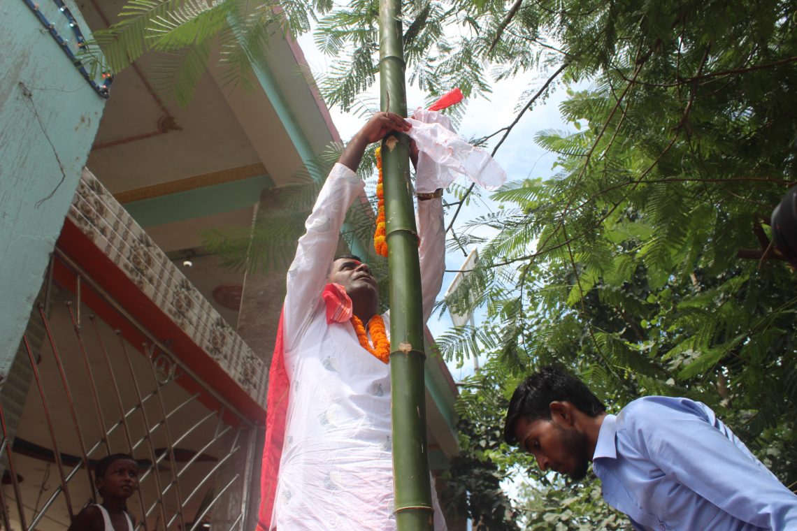 नजिकैको फुलवारीमा साधुसन्त र पुरोहित सहित श्री श्री १०८ माँ दुर्गा भवानी प्रतिष्ठान सबैलाका सचिव नथुनी यादव (हरेराम) को अगुवाईमा विधिपुर्वक बसकट्टी विधि गरि मन्दिरको अगाडि ध्वजा स्थापित गरिएको हो ।