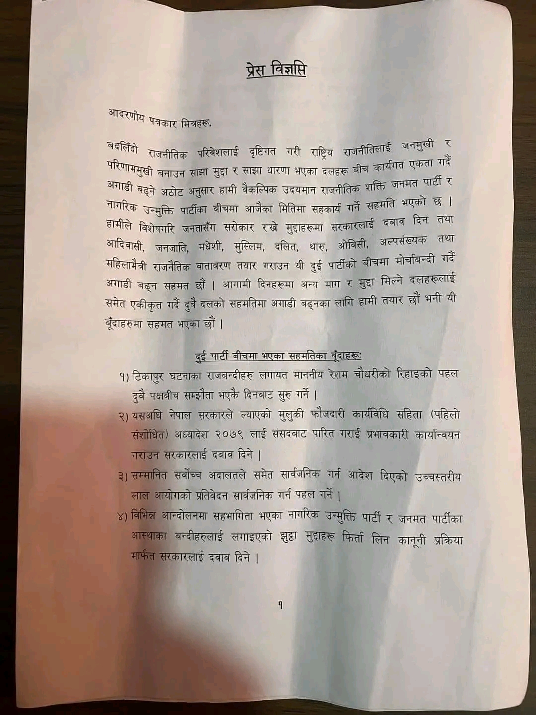सहमतिपत्रअनुसार अब विभिन्न आन्दोलनमा पक्राउ परेका नेता/कार्यकर्ता रिहाइका लागि दुवै दलले मिलेर पहल गर्नेछन् । यस्तै नागरिकसँग सरोकार राख्ने मुद्दाहरूमा सरकारलाई दबाब दिन तथा आदिवासी, जनजाति, मधेसी, मुस्लिम, दलित, थारु, ,अल्पसङ्ख्यक तथा महिलामैत्री राजनीतिक वातावरण तयार गराउन मोर्चाबन्दी गर्दै अगाडि बढ्ने पनि सहमतिपत्रमा उल्लेख छ ।