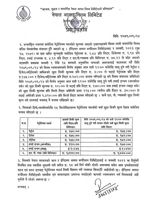 निगमले पेट्रोल र डिजेल/मट्टितेलको मूल्यमा प्रतिलिटर रु तीन र हवाई इन्धन (आन्तरिकतर्फ) प्रतिलिटर रु २० घटाएको छ।