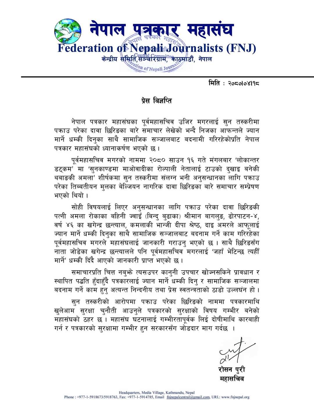 काठमाडौं । नेपाल पत्रकार महासंघका पूर्वमहासचिव उजिर मगरलाई सुन तस्करीमा पक्राउ परेका दावा छिरिङका बारे समाचार लेखेको भन्दै निजका आफन्तले ज्यान मार्ने धम्की दिनुका साथै सामाजिक सञ्जालबाट बदनामी गरिरहेकोप्रति नेपाल पत्रकार महासंघको ध्यानाकर्षण भएको छ ।