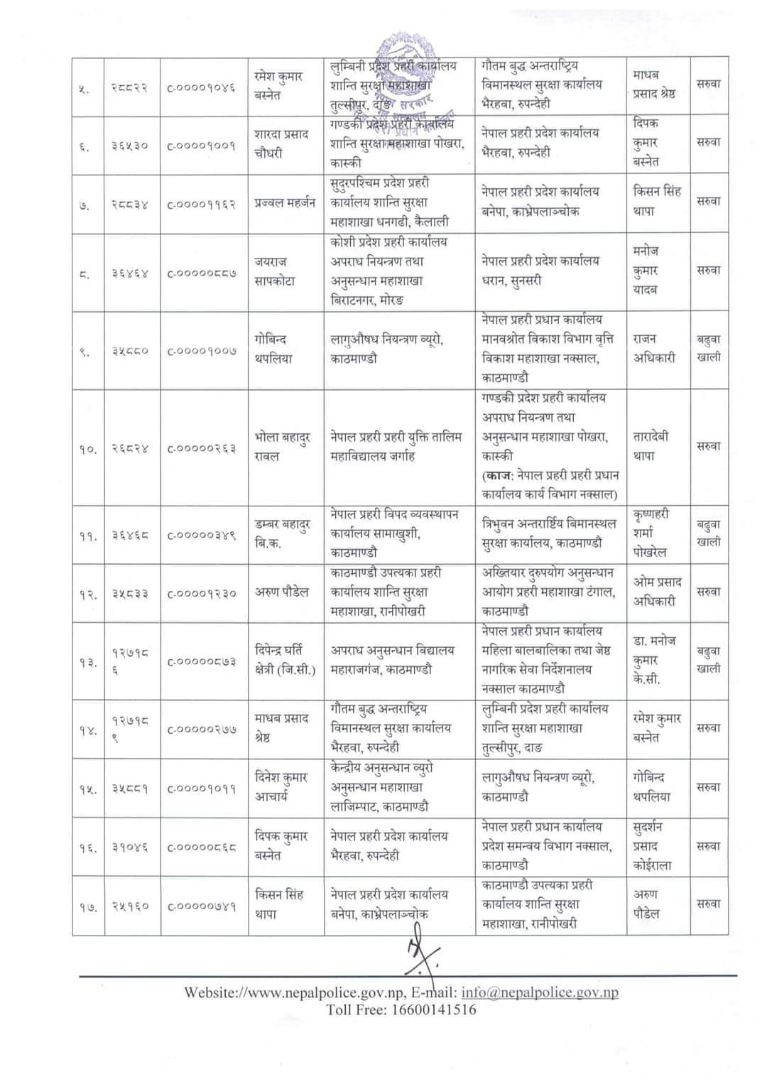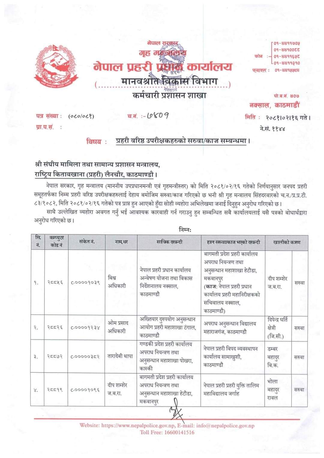 गृहमन्त्री नारायणकाजी श्रेष्ठले गरेको निर्णयअनुसार एसएसपीहरु बिश्व अधिकारी, ओम प्रसाद अधिकारी, तारादेबी थापा, दीप शम्शेर ज.ब.रा.लगायतको सरुवा भएको छ ।