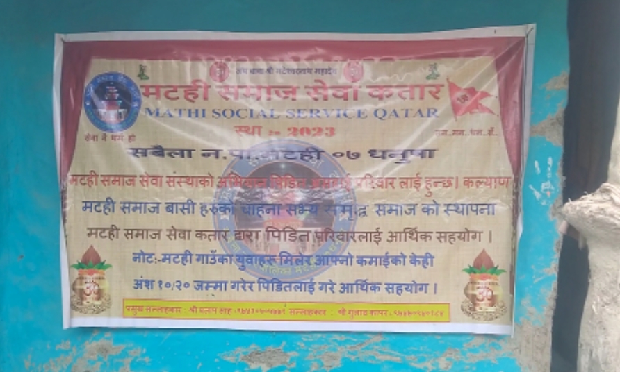 मट्टही समाज सेवा कतार संस्थाले ५ हजार पाच सय ५५ रुपैया नगद आर्थिक खाधन सामग्री चामल, दाल,तेल,आलु साबुन ,चयाउचयाउ,नमक झुल लगायत खाद्यान्न सामग्री सहयोग गरेको छ ।