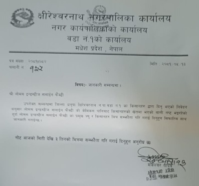२०८१ भादौ १२ गते इन्सेक धनुषा जिल्ला प्रतिनिधि सन्तोष यादव पत्रकारको संयुक्त टोली पीडित कृषक र फ्याक्ट्रीको अनुगमन गर्नुका साथै क्षिरेश्वरनाथ नगरपालिका वडा नम्बर १ का वडाध्यक्ष मकेश्वर यादवसँग कुरा गर्दा त्यतिबेला नै आफ्नो लेटर पेडमा तीन दिनको म्याद राखी फाइटिङलाई पत्र काटेका थिए। तीन दिनभित्र पीडित कृषकहरूको क्षतिपूर्ति वा छलफलमा नआएपछि हामी आन्दोलन गर्न बाध्य हुन्छौ अध्यक्ष यादवले बताए ।