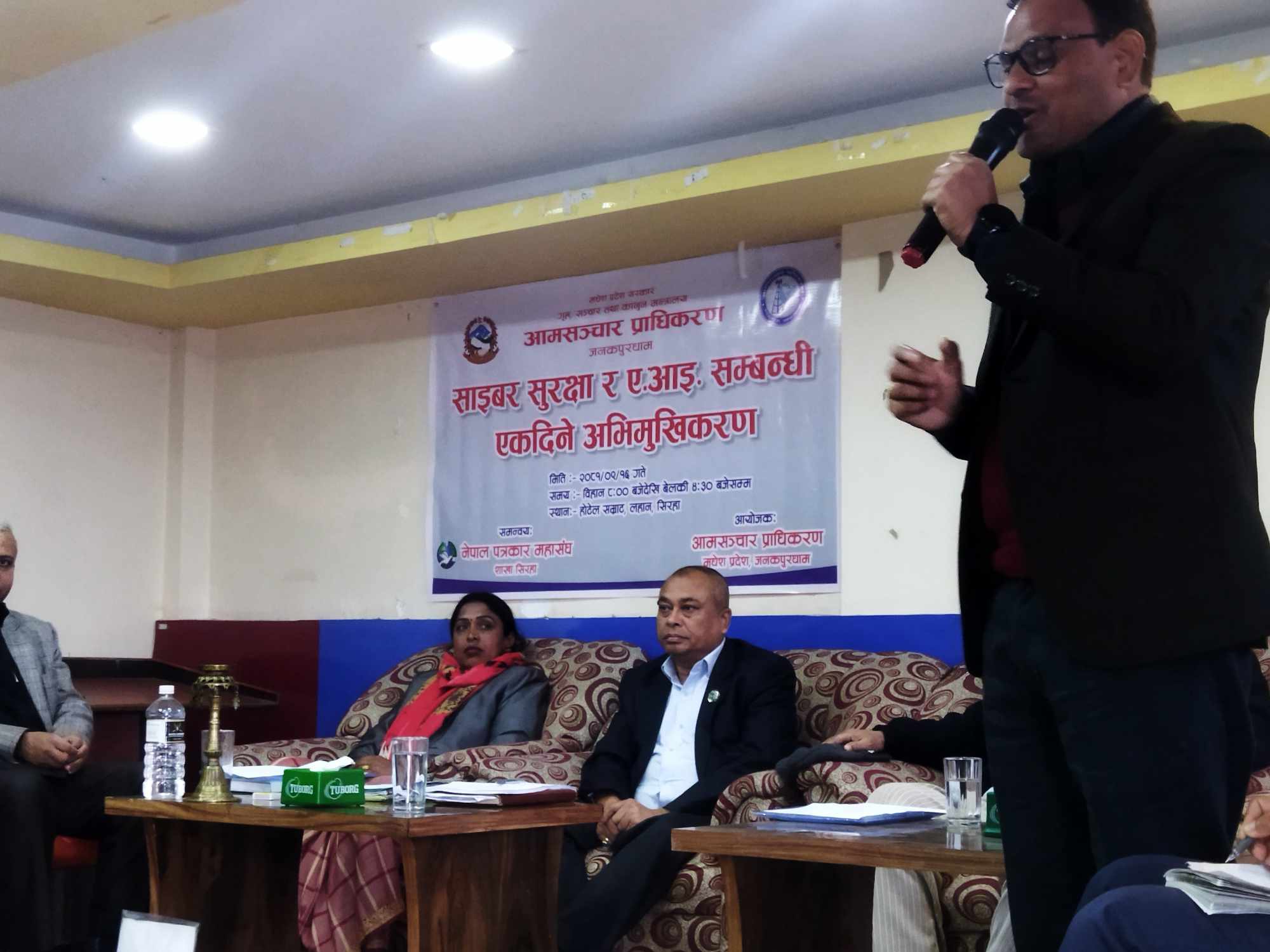 गृह सञ्चार तथा कानुन मन्त्रालय तथा आमसञ्चार प्राधिकरण मधेश प्रदेशको आयोजना तथा नेपाल पत्रकार महासंघ सिराहा शाखाको समन्वयमा साइबर सुरक्षा तथा ए.आई. सम्बन्धि एकदिने अभिमुखिकरण कार्यक्रम सम्पन्न भएको छ।