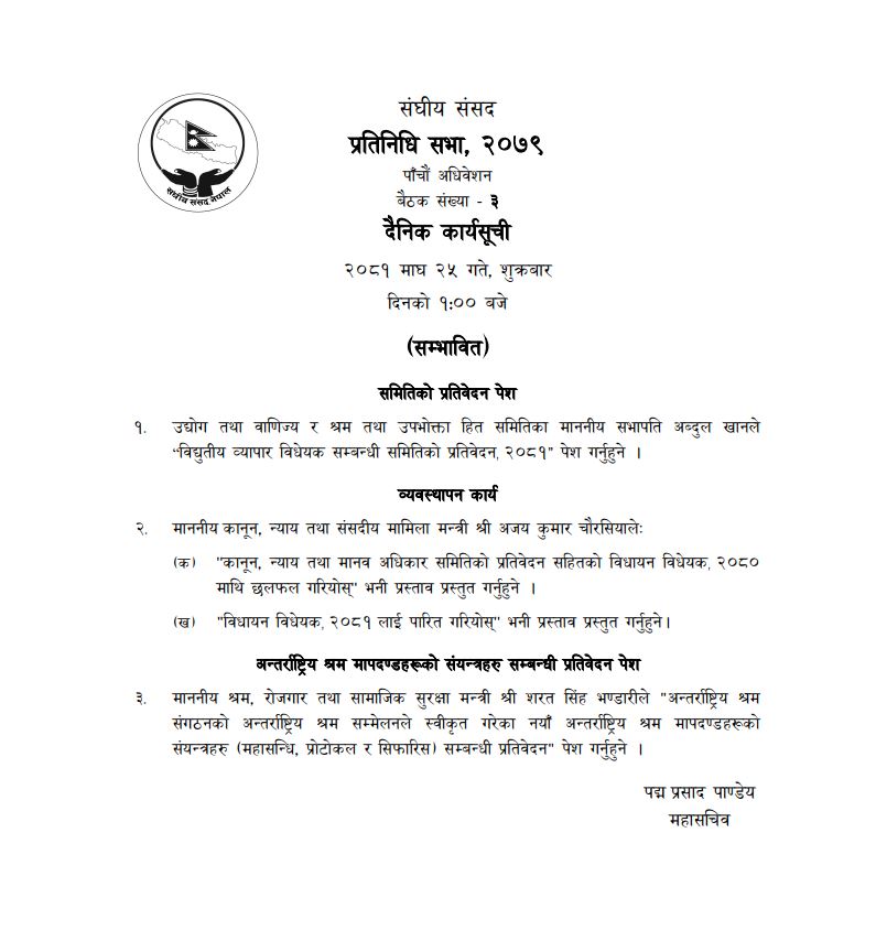 संघीय संसद सचिवालयका अनुसार आजको बैठकमा उधोग तथा बाणिज्य र श्रम तथा उपभोक्ता समितिका सभापति अब्दुल खानले ‘बिधुतीय ब्यापार विधेयक सबन्धी समितिको प्रतिबेदन, २०८१ पेश गर्ने’ छन् ।