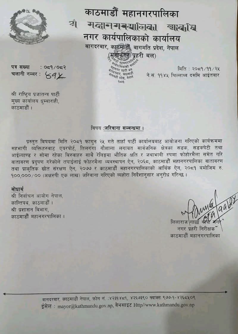 वातावरण प्रदूषण गरेकोले फोहरमैला व्यवस्थापन ऐन, २०६८, काठमाडौं महानगरपालिका वातावरण तथा प्राकृतिक स्रोत संरक्षण ऐन, २०७७ र काठमाडौं महानगरपालिकाको आर्थिक ऐन, २०८१ बमोजिम एक लाख रूपैयाँ जरिवाना गरिएको महानगरले जनाएको छ ।यसअघि बालेन शाहले नेकपा एमालेलाई पनि वातावरण प्रदूषण गरेको भन्दै जरिवानाको पत्र काटेको थियो ।