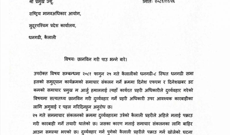 धनगढी । जिल्ला प्रहरी कार्यालय कैलालीमा कार्यरत प्रहरी निरीक्षक दर्शन खड्कामाथि महिला पत्रकारलाई दुर्व्यवहार गरेको आरोप लागेको छ ।आइतबार धनगढी–८ स्थित धनगढी सभा गृहको उद्घाटन कार्यक्रमको समाचार सङ्कलन गर्न पत्रकार आरजु हमाल पुगेकी थिइन् । सो सभा गृहको प्रधानमन्त्री केपी शर्मा ओलीले उद्घाटन गरेका थिए ।