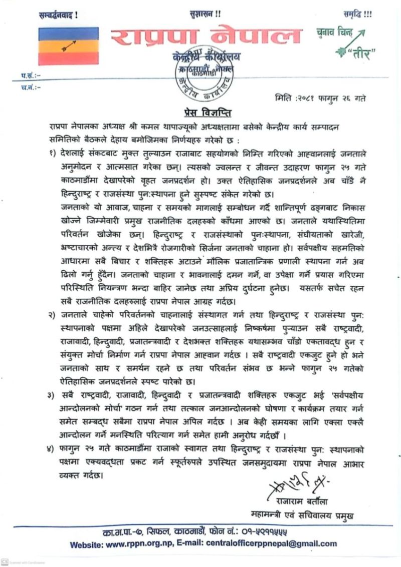 बैठकपछि जारी विज्ञप्तिमा भनिएको छ, ‘जनताको चाहना र भावनालाई दमन गर्ने, वा उपेक्षा गर्ने प्रयास गरिएमा परिस्थिति नियन्त्रण भन्दा बाहिर जानेछ तथा अप्रिय दुर्घटना हुनेछ। यसतर्फ सचेत रहन सबै राजनीतिक दलहरूलाई राप्रपा नेपाल आग्रह गर्दछ।’